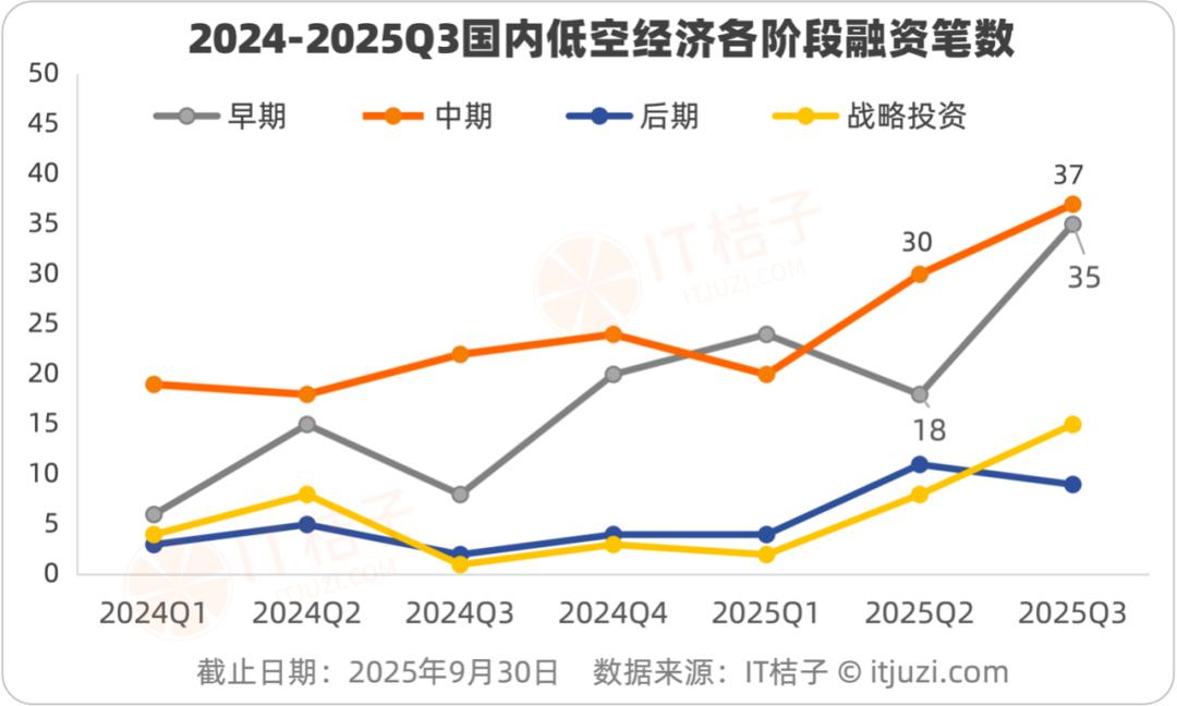 据IT桔子统计,2025年前三季度,国资参与的低空经济企业融资交易数达到了151笔,在整体交易中的占比为40.3%,相比去年提升了3个百分点。