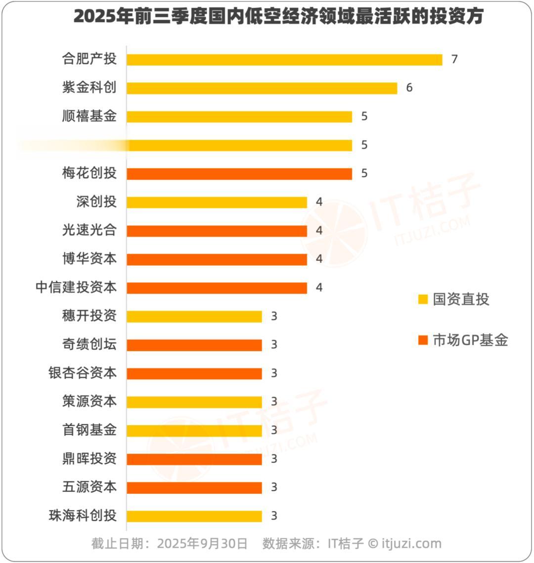 据IT桔子统计,2025年前三季度国内低空经济领域最活跃的投资方中,国资直投包揽了TOP5名单中的前四名,仅梅花创投这家早期投资基金入围前五。