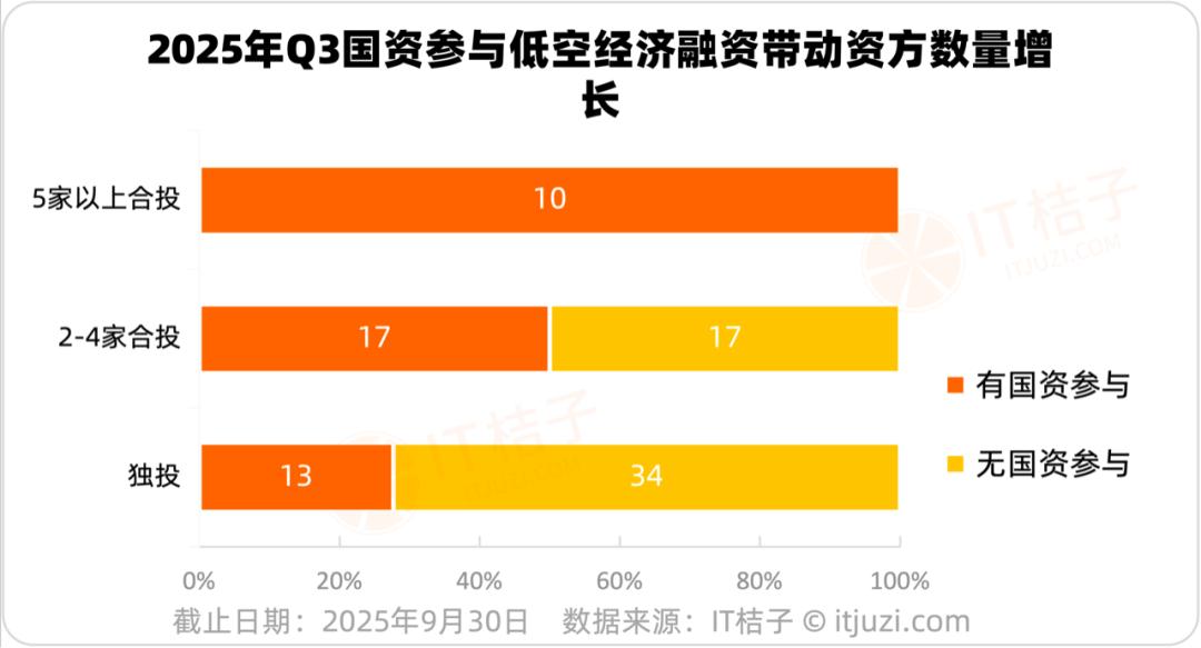 2025年三季度,获得5家以上合投的低空经济企业融资交易有 10 例,这 10 例均有国资背景机构参与其中,占比100%;而针对有2-4 家投资方合投的情况,有国资参与和无国资参与的案例均为17例,二者占比持平,各一半;独投事件下,无国资参与的独投案例有34例,占比达七成。