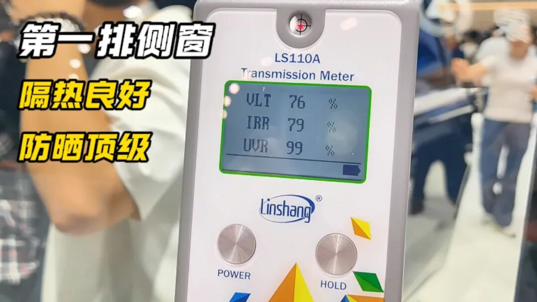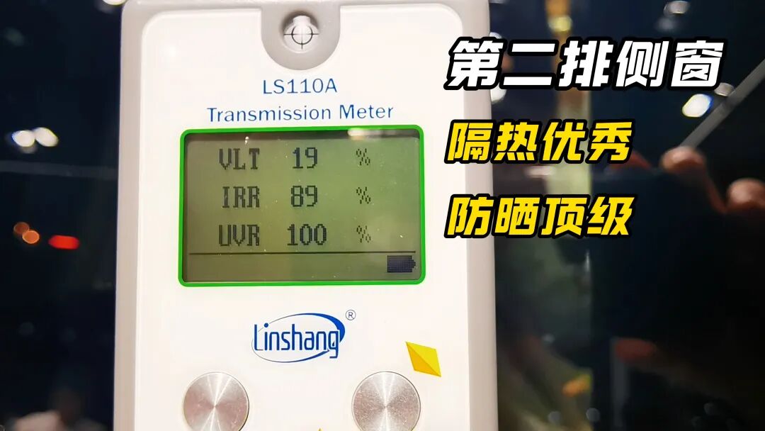 岚图梦想家 2026款第一排侧窗测下来,红外阻隔率(IRR)为79%,紫外阻隔率(UVR)有99%,这组数据在市面上横向对比的话,算是很好的那一档,隔热又防晒。不过,透光率(VLT)仅为76%,透光冗余还剩下6个百分点,要想贴膜的话,可以选择的产品其实不多。