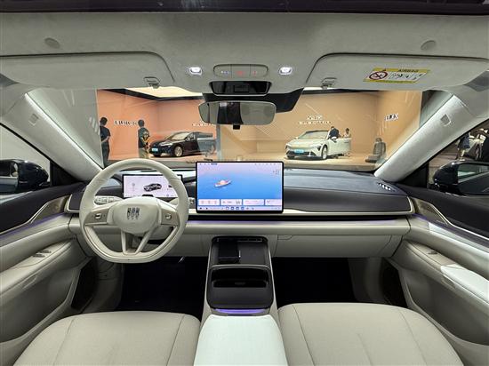进入车内,这款车的内饰给人的第一感觉是很符合当下新能源车的设计特点,科技感、简约感拿捏得很到位。前方是一块50英寸的AR-HUD,10.25英寸全液晶仪表盘和 15.6英寸中控屏。配备高通最新一代 SA8775P 芯片,具备主流的功能及使用体验。手机互联方面,支持苹果、鸿蒙、安卓任一款手机投屏,或者连接 CarPlay、Hicar。