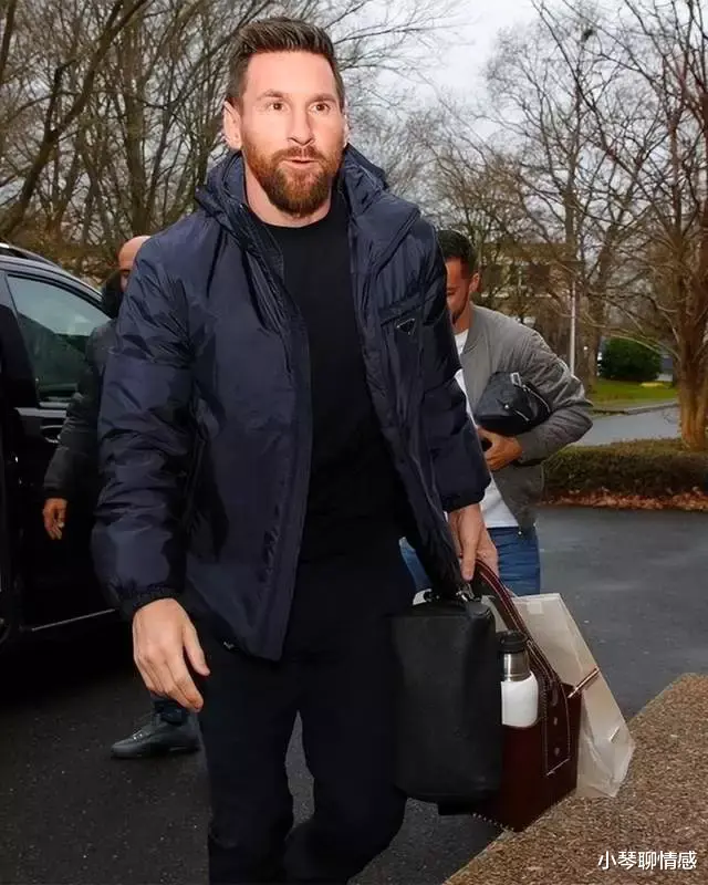 梅西穿着一身Prada的羽绒服,拎着三个包包。