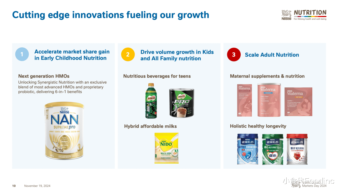 她说,雀巢完全有能力成为从孕前到支持健康老龄化的营养品的“全球领导者”,这主要是考虑到:公司在全球各地市场都有深厚的业务、生产设施和分销网络;另外,雀巢营养品覆盖了从高端到主流的所有价格带;最后,她认为雀巢拥有“独特的科学技术”,使其能够在所有领域推出“突破性的创新”,其中的优势领域包括益生元、糖分减少技术等。
