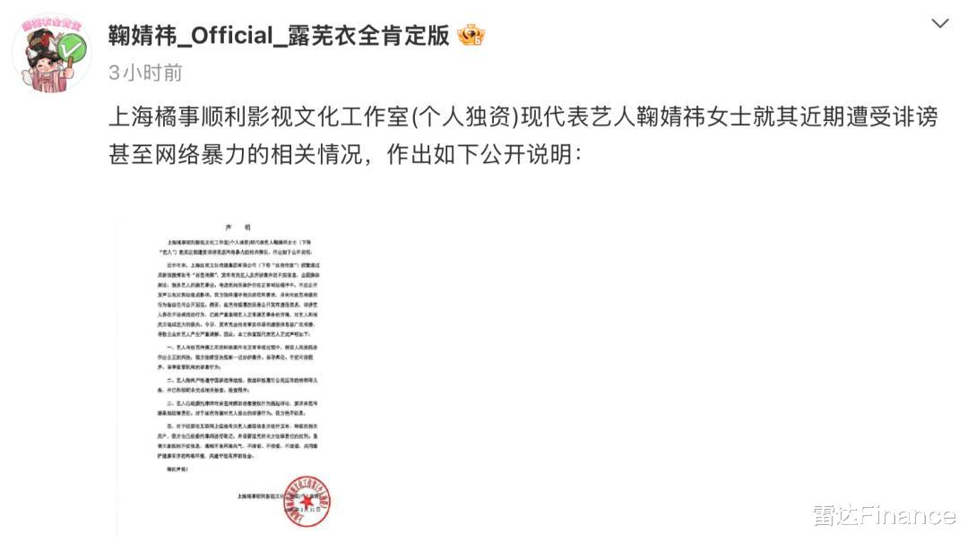 鞠婧祎工作室还在前述说明中提到,近半年来,丝芭传媒频繁发布有关艺人及所涉案件的不实信息,企图操控舆论,扼杀艺人的演艺事业。