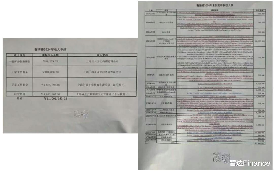 举报材料显示,鞠婧祎2024年全年申报收入约1100万元,其中近500万元来源于其原经纪公司。而仅2024年6月至12月期间,鞠婧祎参加的影视、商务等活动就不下20多项,保守估计收入不少于5000万元,瞒报比率近88%。