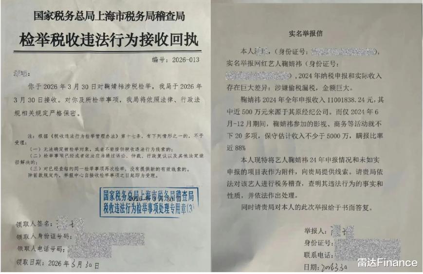 国家税务总局上海市税务局稽查局于2026年3月30日出具《检举税收违法行为接收回执》(编号:2026-013),表明已受理举报并启动稽查程序,同时承诺对举报人信息严格保密。