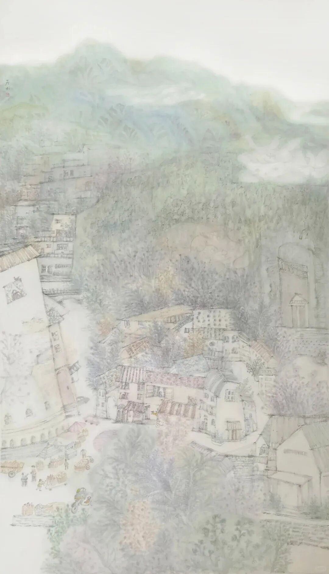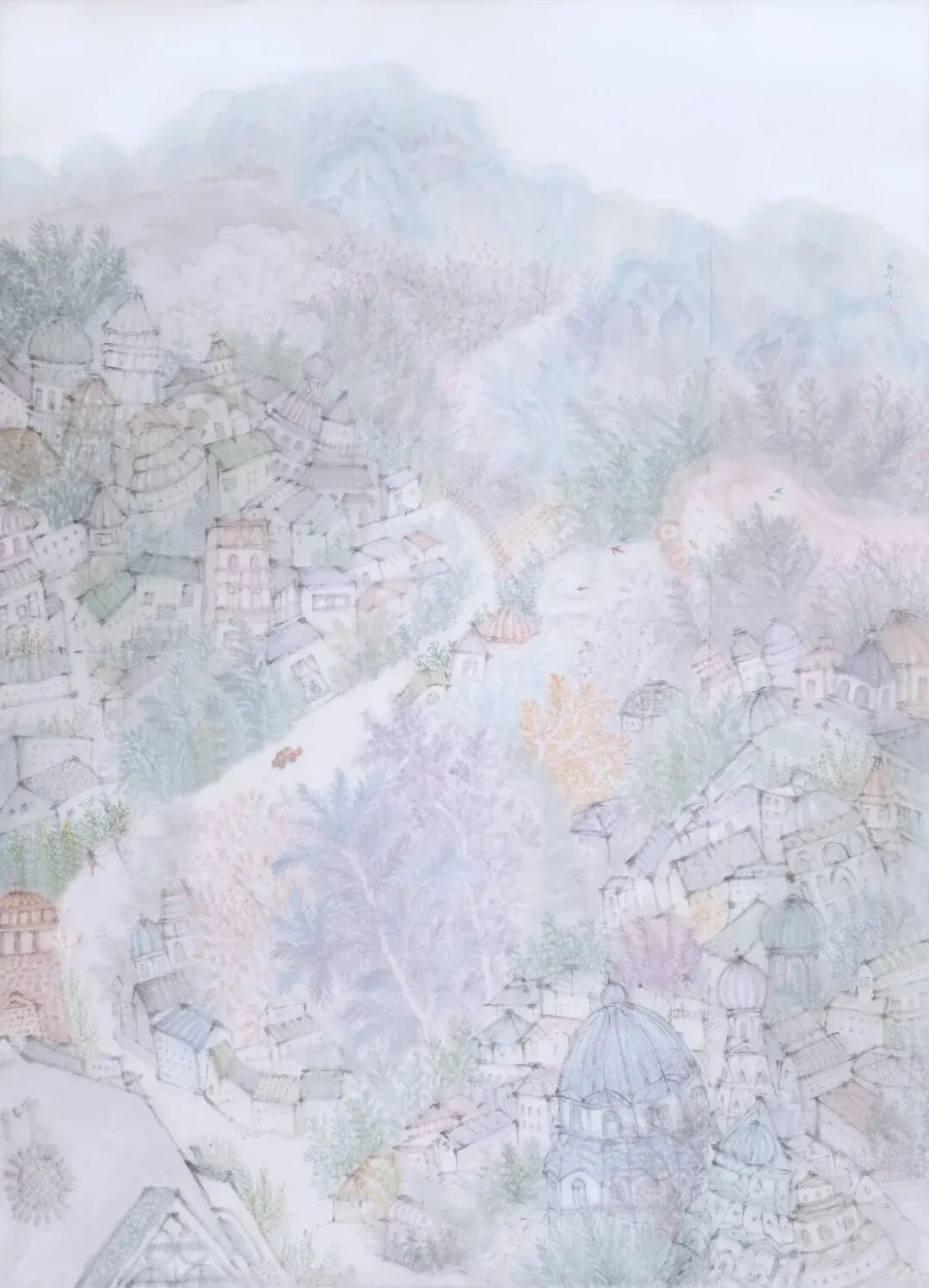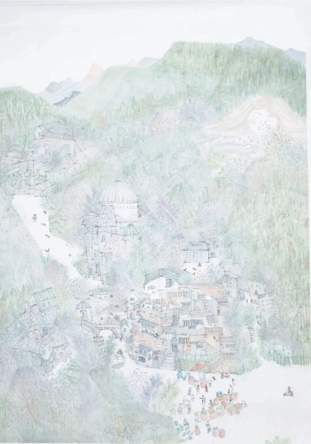 于是我开始以赤子之心重塑笔墨:让花青糅合藤黄点染葱茏梦境,赭石为山岩披上童话霞衣;将峭壁幻作积木城堡,溪流蜿蜒成银铃飘带;借氤氲墨韵在画里织就慢时光。传统皴擦成了“过山车”,积墨层染变成“棉花糖”——我画的是山水,更是自己重新长出来的童年。