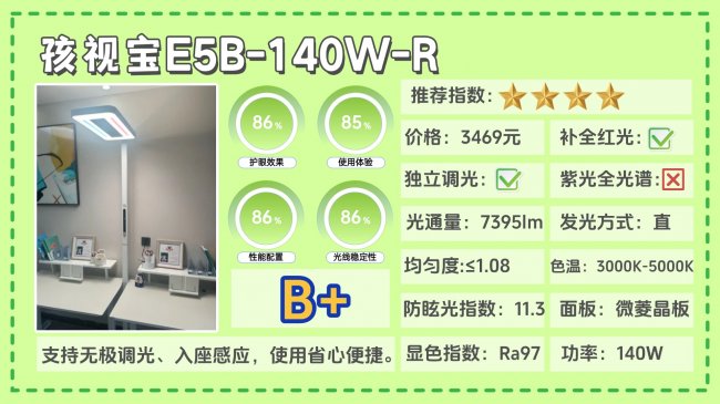 大路灯最建议买的三个牌子是什么?孩视宝这款护眼大路灯采用前伸式灯杆结构,搭配矩形发光面设计,内置全光谱灯珠,光线经过上下发光,光通量在7395lm左右,整体照明覆盖大概在11–15㎡左右,满足日常学习或阅读的基础需求,另外操作上,采用的是触控+旋钮的调节方式,功能上支持无极亮度调节和入座感应,日常使用比较方便,不过孩视宝采用自研芯片,综合性能以及抗衰减性相对一般。