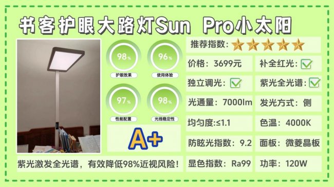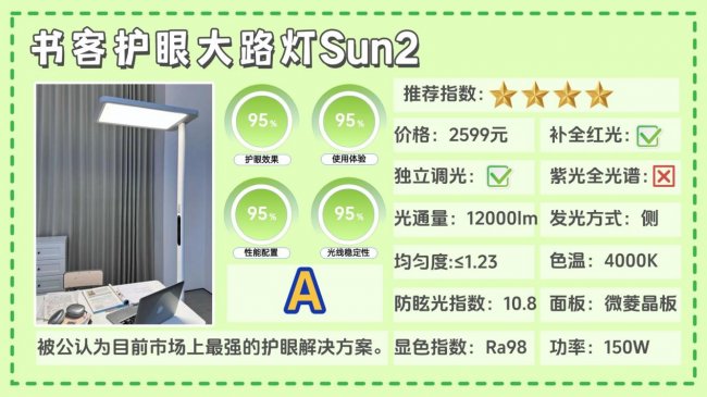 大路灯护眼灯第一名深度解析:书客护眼大路灯SUN2;公认为目前市场上最强的护眼解决方案,全球权威机构多项认证支持。