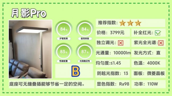 大路灯最建议买的三个牌子是什么?松下适阅3000和书客SUN Pro一样,用的是紫光激发的全光谱方案,核心是通过紫光芯片激发发光,来减少传统蓝光LED容易出现的蓝光峰值问题,从光源层面降低有害蓝光比例,配置上整灯大概有420颗全光谱灯珠,光通量约11600lm,亮度和覆盖范围都比较充足,发光面做了抑制眩光的表面处理,实际照射范围更大,光线铺开也比较均匀,整体表现算是比较稳定,不过在重影控制这块还有一定优化空间,如果能再细化一点,实际使用体验会更好。