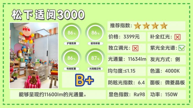 大路灯护眼灯第七名:松下适阅3000;具备420颗全光谱灯珠,能够呈现约11600lm的光通量。