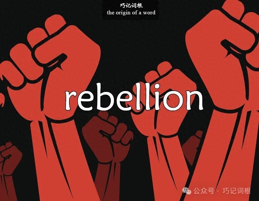 “Rebellion”源自拉丁语“rebellio”,意为“反抗”或“叛乱”,由“re-”(相反)和“bellare”(战斗,源自“bellum”,战争)组成。14世纪经古法语“rebellion”进入英语,指对权威的抗争或起义。演变路径:拉丁语 rebellio → 古法语 rebellion → 中古英语 rebellion(约14世纪)。
