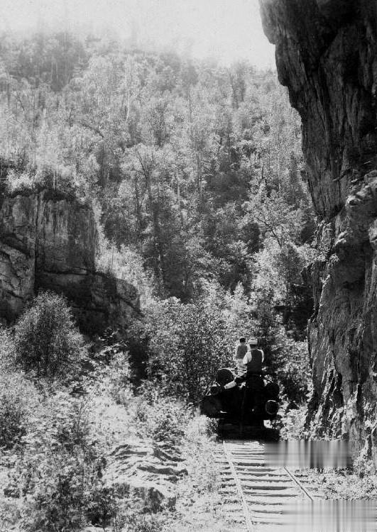 从山上砍伐下来的木材,除了通过水路运输外,还可以通过火车运输。照片中,一列小火车装载着木材正运往山外。