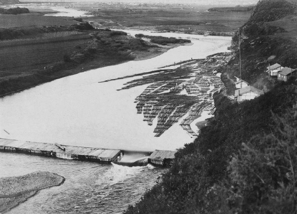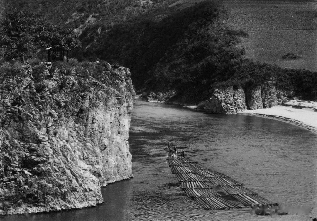1930年,鸭绿江好仁面风光,江水在这里变得平稳,木排缓慢飘向下游。两岸是悬崖绝壁,岩石上修建有亭子,景色很壮观。