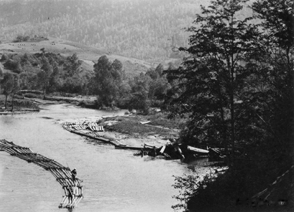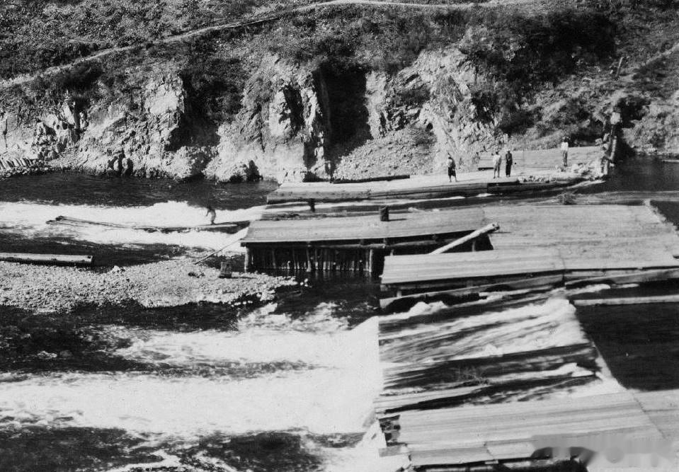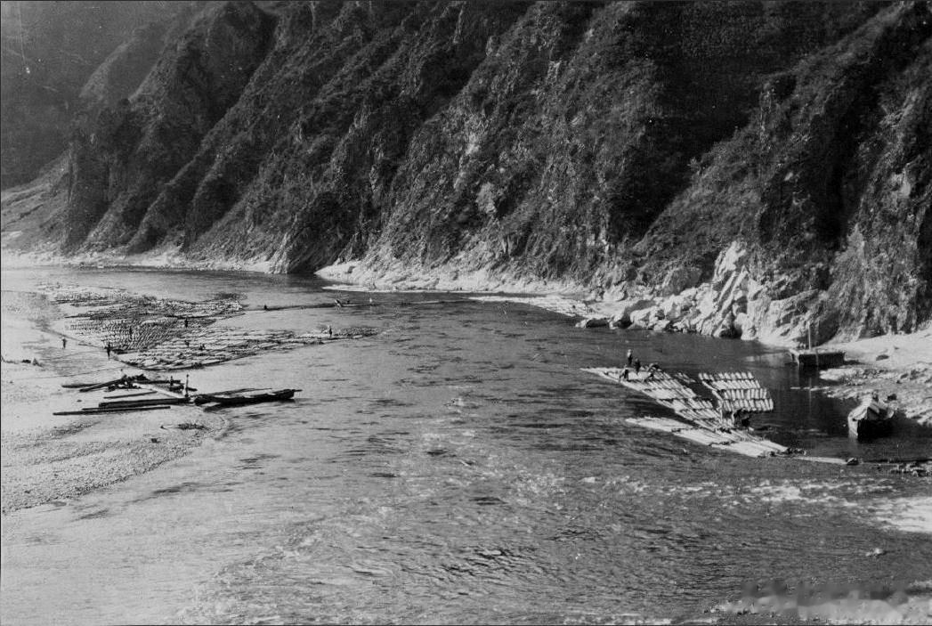 长白山林业资源丰富,从山上砍伐下来的木材,串成木排筏,顺流而下,运输到各地。江面上放排人正在调整木排前进方向,以便能顺利通过“铁炮堰”的狭窄缺口。