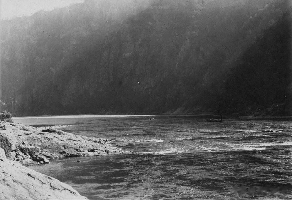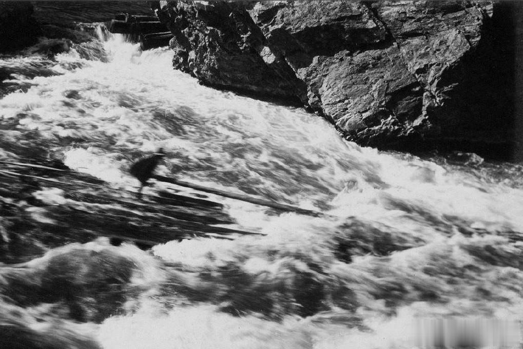 在这张照片里,一名放排人正驾驶木排穿越激流险滩。只见江水湍急,冲击岸边石壁泛起白色的水花,场面真是惊心动魄!