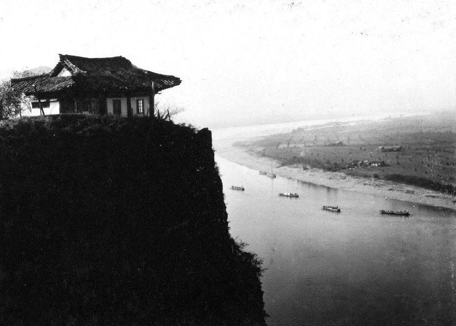 近处绝壁上这座古建筑叫“洗剑阁(亭)”,它位于朝鲜慈江道满浦市鸭绿江畔。亭子建在90多米高的山头上,1938年毁于火灾。
