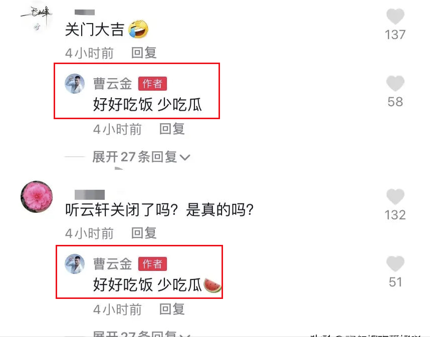 后来,有网友在社交平台询问曹云金本人此事是否为真,曹云金称:好好吃饭少吃点瓜。