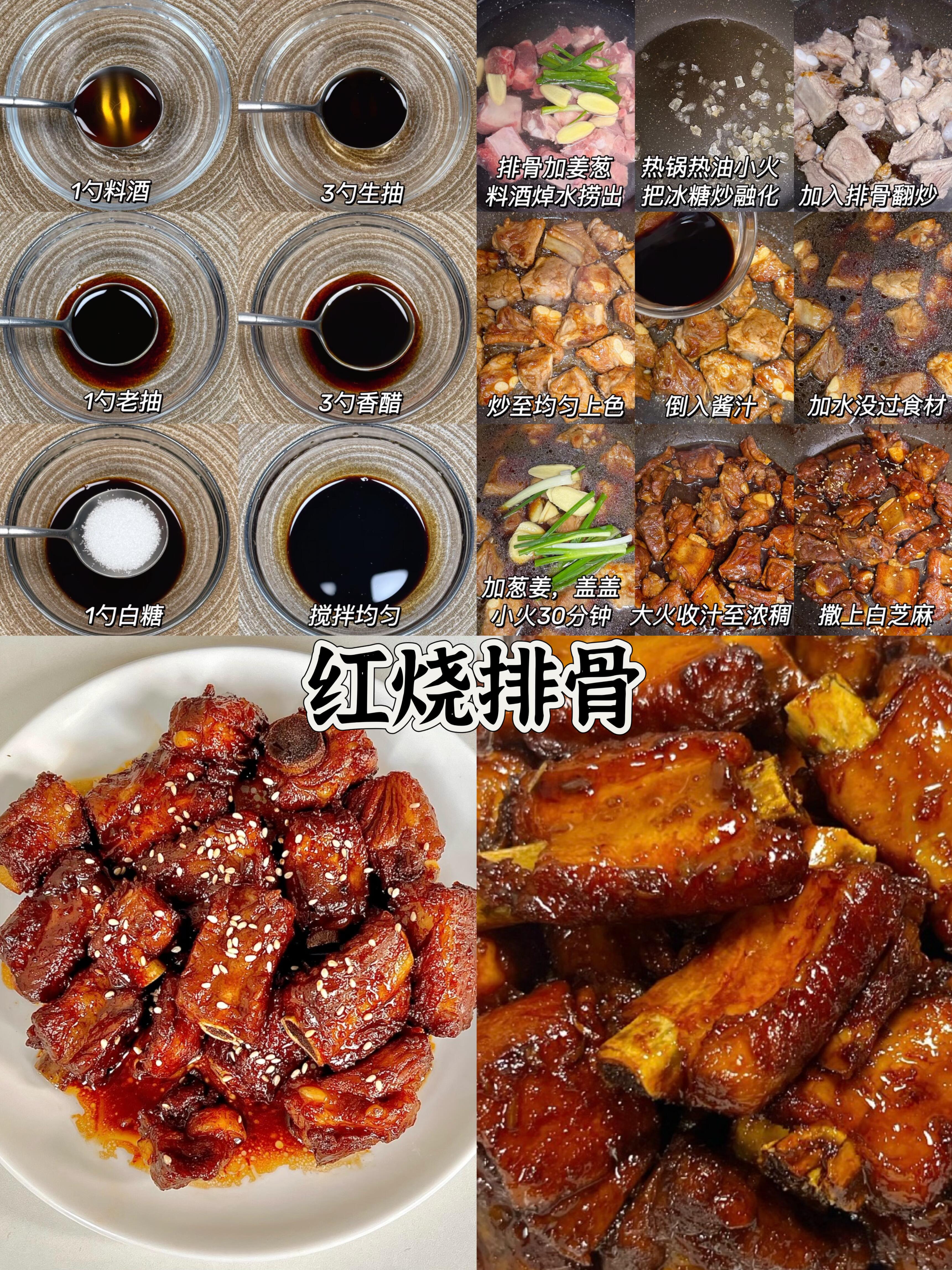 食材准备:排骨1斤、葱姜适量、料酒1勺、生抽3勺、老抽1勺、香醋3勺、白糖1勺、冰糖适量、清水适量、白芝麻少许。