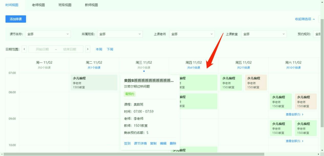 课时管理:支持课时分层管理,可按课程类型、授课教师统计课时消耗,课时记录可关联学员学习报告,便于机构分析课程适配度。