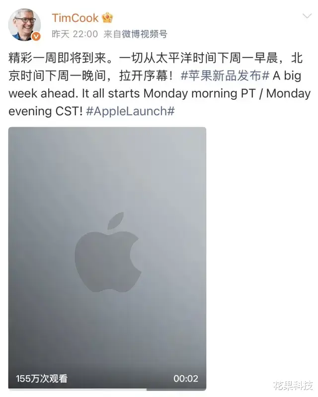 现在库克正式在社交媒体发文表示:精彩一周即将到来,一切从北京时间下周一晚间,拉开序幕。