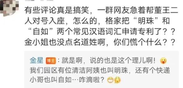 15日,金星在回复网友的评论时说:“我们园区有位清洁阿姨也叫明珠,还有个快递小哥也叫自如,咋滴啦?”相当于直接否认了自己是在讽刺董明珠和王自如。