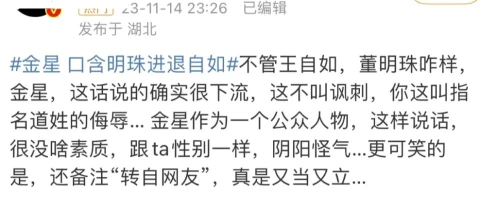 也有网友指责金星,“这不是内涵不是调侃,而是赤裸裸的侮辱,而且格调很low的那种”。