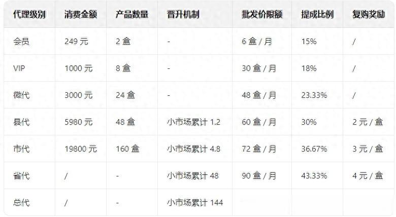 - 层级收益递增:从提成比例(15%→50%)、批发限额(6盒→120盒/月)到复购奖励(县代2元/盒→总代5元/盒),每升一级,收益天花板都大幅提升。