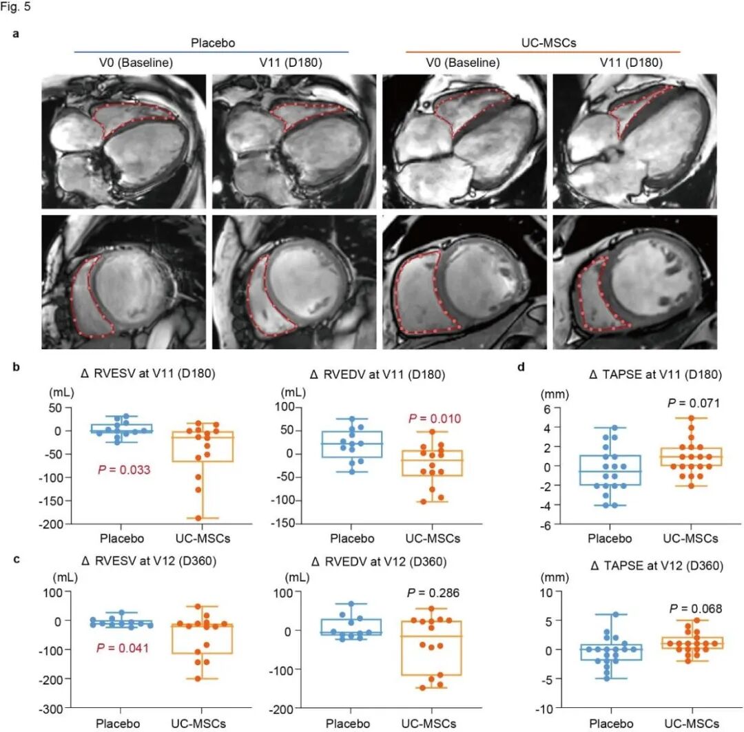 (注:UC-MSC组患者右心室收缩末期容积(RVESV)在180天和360天时均显著改善,TAPSE同步提升)
