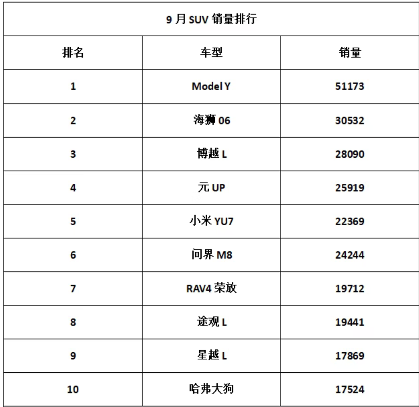在整个9月,国内SUV市场的竞争可以说“血流成河”。比亚迪海狮06以30,532辆排名第二,特斯拉Model Y以51,733辆稳居第一,而小米YU7,作为一个刚刚入场的新品牌,居然一脚踩进前五。