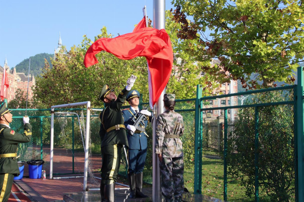 晨光中,国旗护卫队步伐铿锵,护送五星红旗正步前行。在雄壮的国歌声中,鲜艳的国旗冉冉升起,全体师生肃立行注目礼,现场气氛庄严隆重。