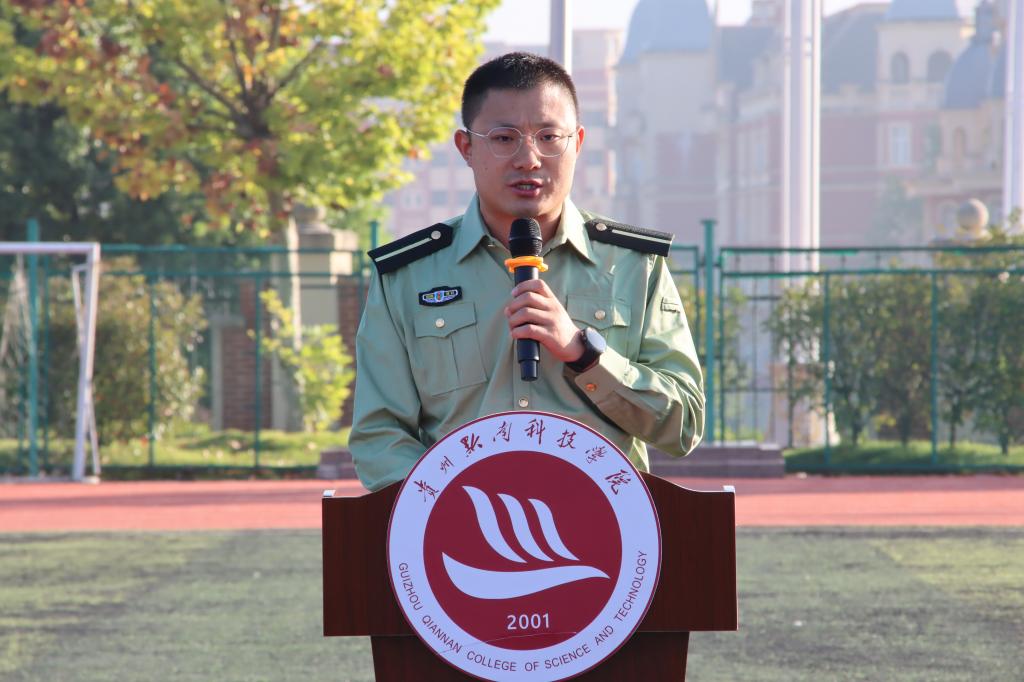 贵州黔南科技学院党委委员、副校长张耀赠作爱国主义教育宣讲。他指出,爱国是青春最厚重的底色,也是大学生立德成才的根本。他勉励新生们把个人理想融入党和国家事业,通过军训锤炼意志、增强体质、培养纪律,筑牢成长根基,努力成为担当民族复兴大任的时代新人。