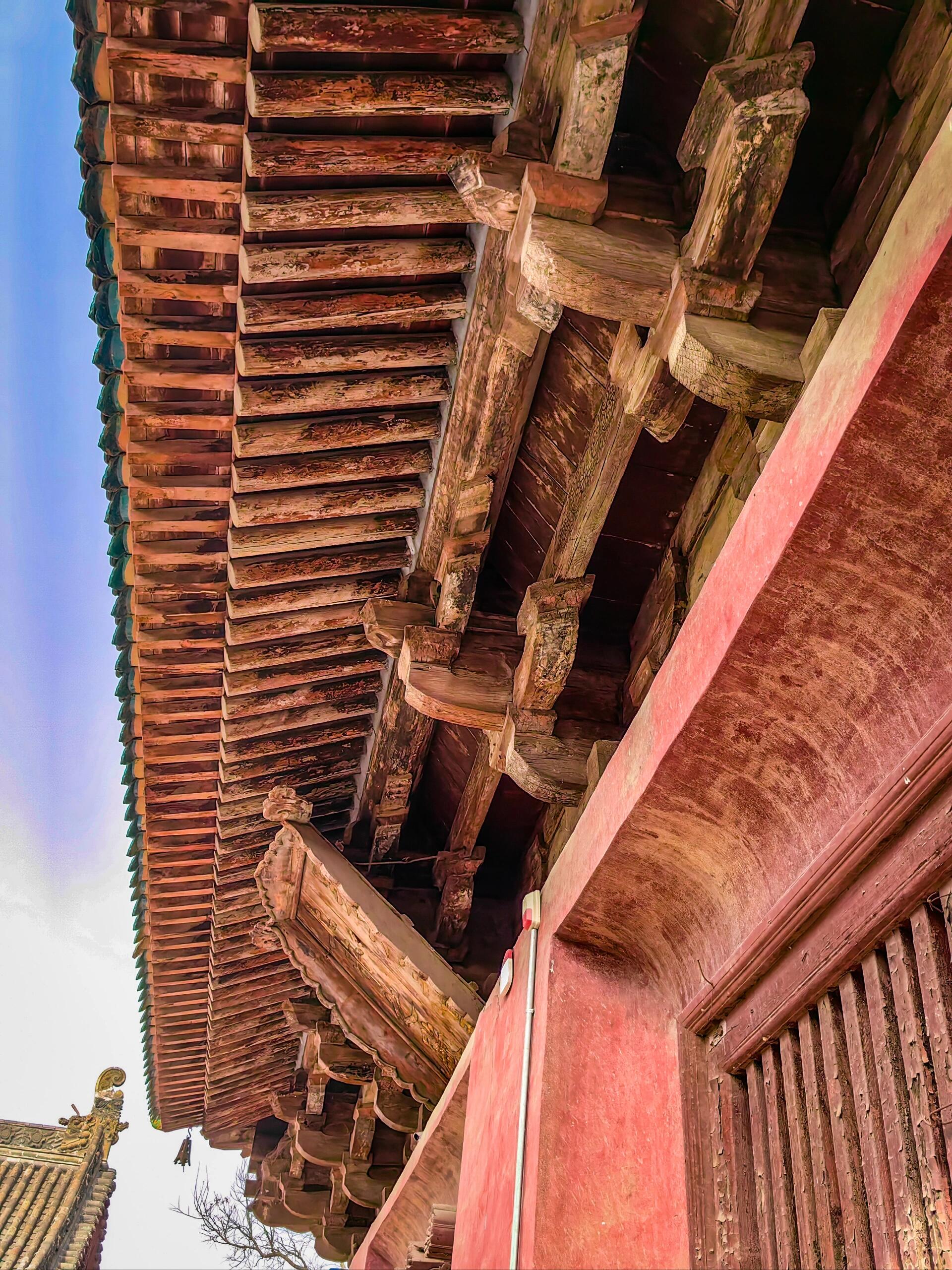 继续沿着中轴线前行,便来到了太符观的核心建筑——昊天玉皇上帝殿。这座大殿为金代原构,是整个道观的精华所在。大殿坐落在高高的台基之上,台基由青石砌成,历经近千年的岁月,依然稳固如初。殿身面阔五间,进深六椽,单檐歇山顶,屋檐微微起翘,如同一双展翅欲飞的翅膀。檐下的斗拱粗壮而简洁,每一朵斗拱都像是一件精美的艺术品,既承担着支撑屋檐的实用功能,又具有极高的装饰价值。这些斗拱采用了金代典型的建筑手法,层层叠加,错落有致,展现出了金代建筑雄浑大气的风格。