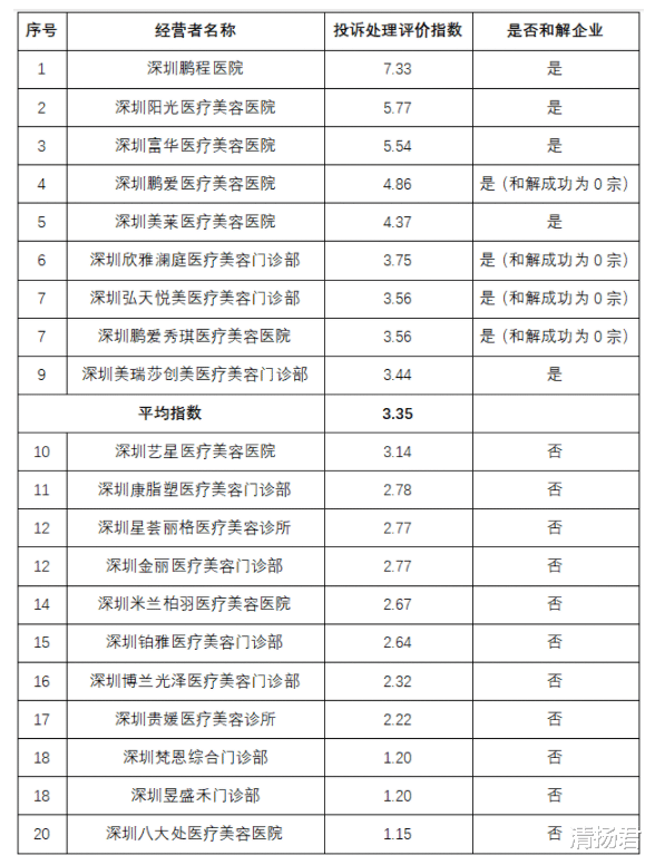 这份榜单涵盖了统计期内有效投诉量达到3宗及以上的20家医美机构。结果显示,它们的平均投诉处理评价指数仅为3.35分(满分10分)。