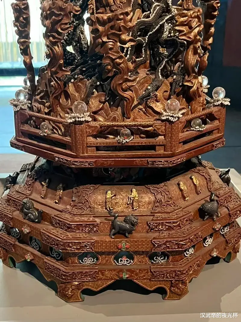 宝幢通高122.6 厘米,主体由珍贵楠木打造,自下而上分为须弥座、佛宫、塔刹三部分,通体镶嵌近四万颗珍珠,辅以水晶、玛瑙、琥珀、金银、檀香木等佛家 “七宝”,工艺繁复到令人窒息。