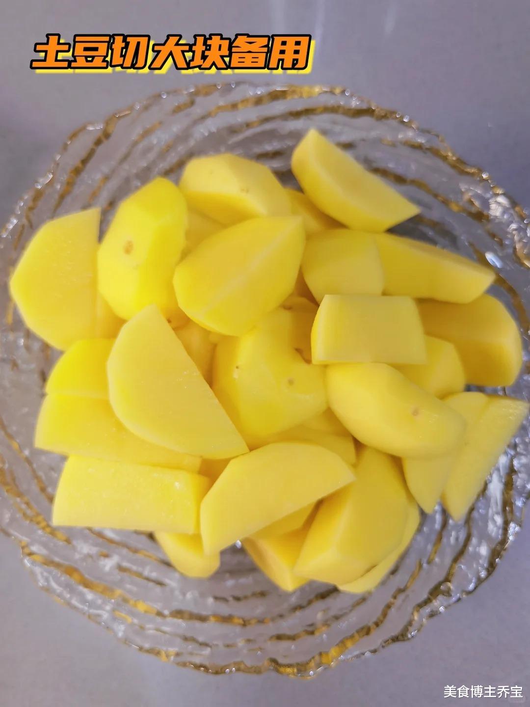 2、将土豆去皮,洗净后切成滚刀块。为了防止土豆氧化变黑,可以将切好的土豆块放入清水中浸泡。葱姜蒜处理:大葱切段,姜切片,大蒜拍扁备用。