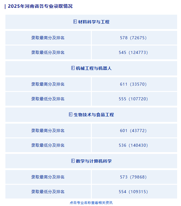 到了2025年,学校对河南招生专业做出了明显调整,停招化学、化学工程两个传统基础专业,新增数学与应用数学(计算机方向)热门专业,保留材料、机械、生物三大核心工科,分数线也呈现出很明显的分化特点。