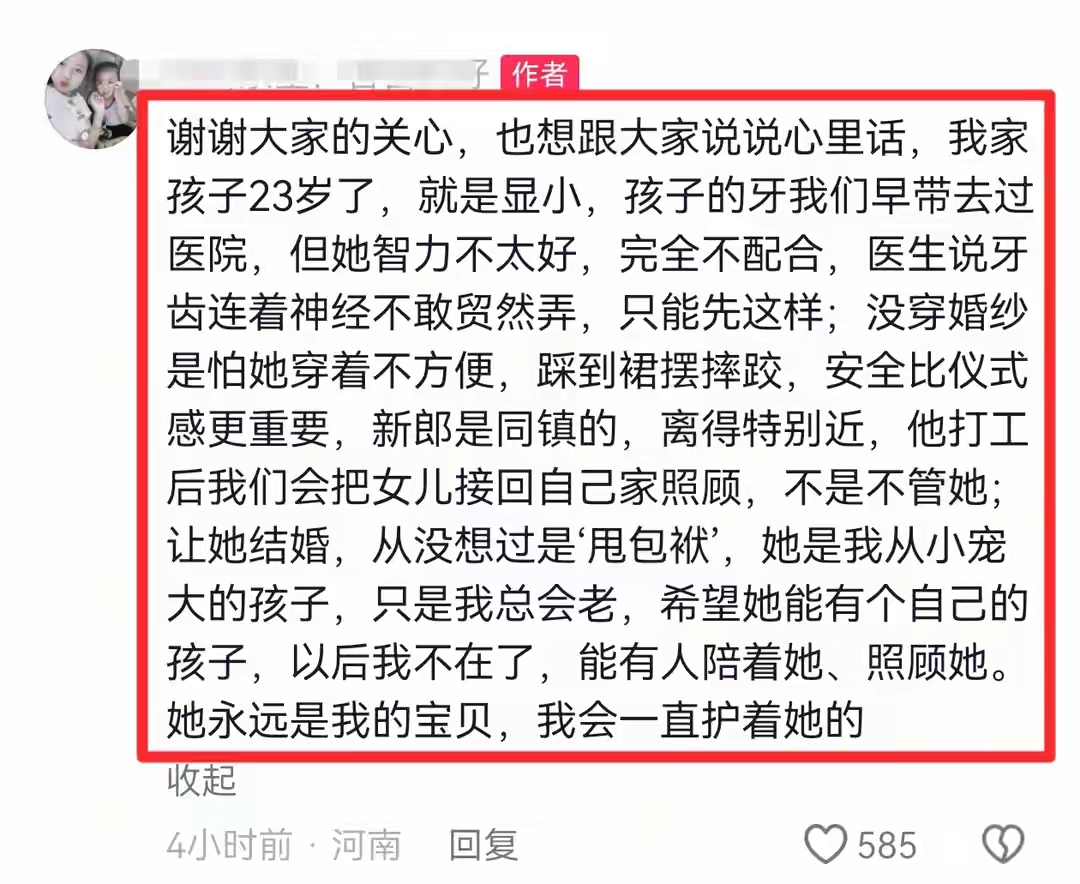 有网友说,男方新郎不智力残疾,那男方父母肯定不清头。再生个孩子,智力更差,别问我咋这样说,因为我们这里就有一个,是男孩儿智力残疾,生个闺女更智力残疾,据说闺女也快结婚了。