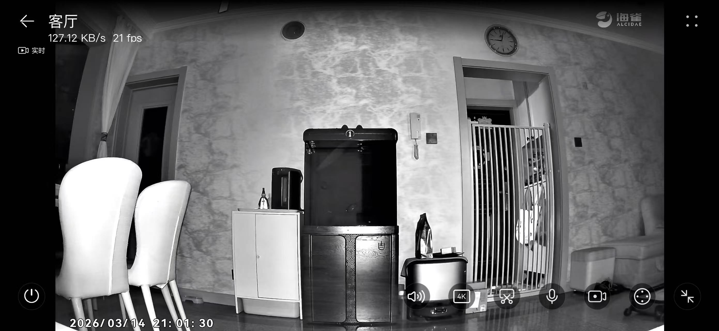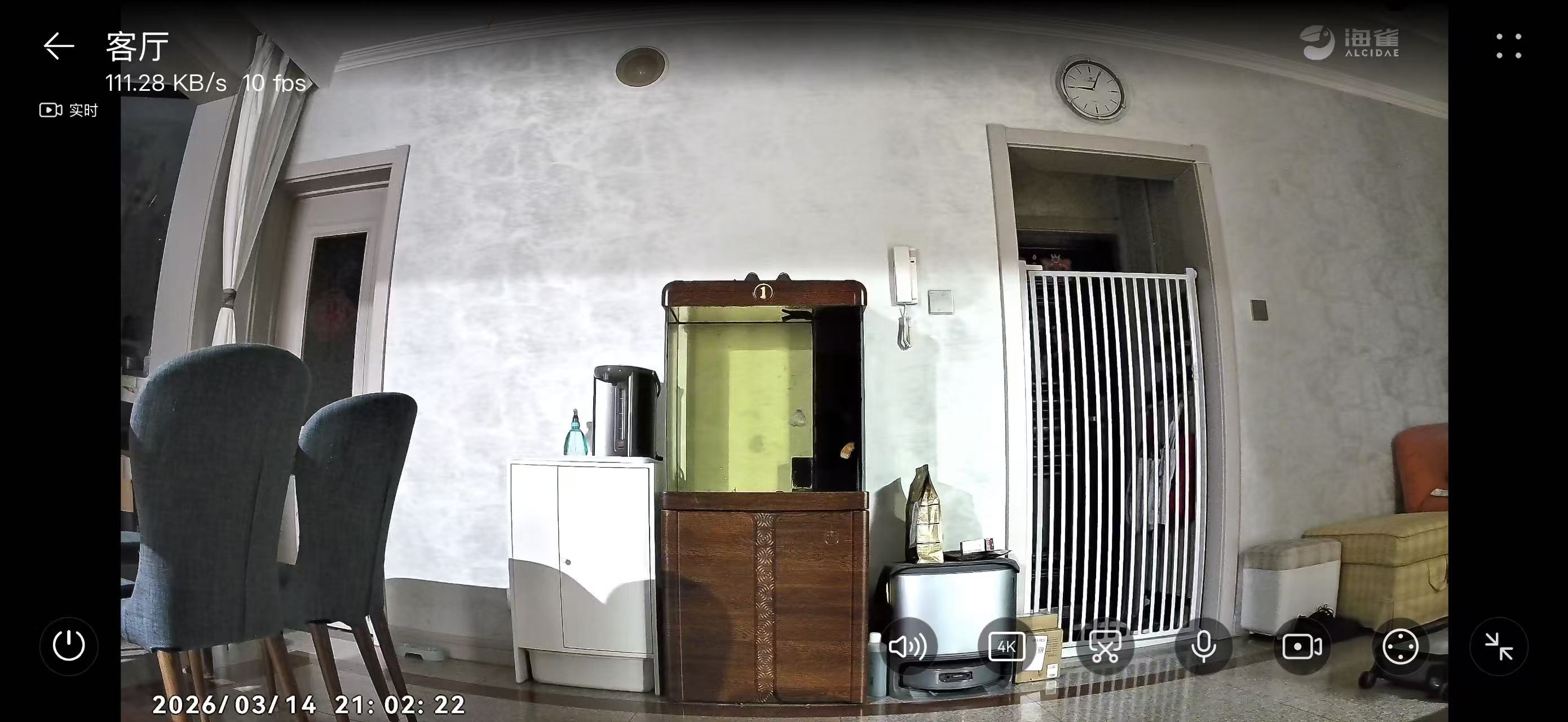 除了日常的监看外,海雀雀蛋还可以检测宠物并进行跟踪拍摄,能够区别出人型物体,实现智能看家。并通过APP反馈到手机上。我们通过手机,可以实时监看家里的情况。比如说,我正巧抓拍到这只想要“摸鱼”的憨憨。