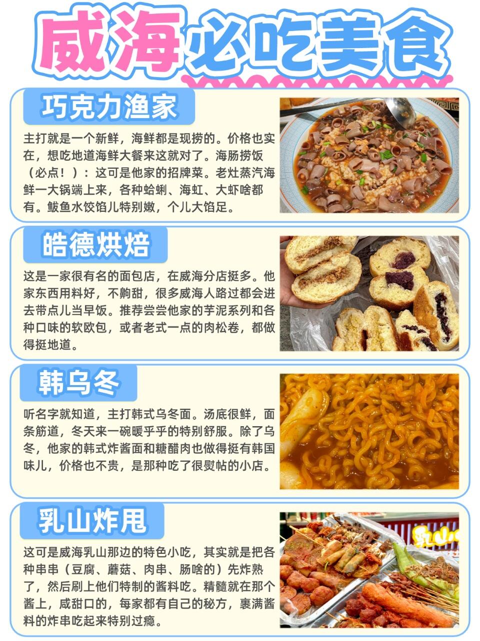 还有皓德烘焙的芋泥面包、韩乌冬的韩式乌冬面、乳山炸甩的秘制酱料炸串,都是本地人常吃的!