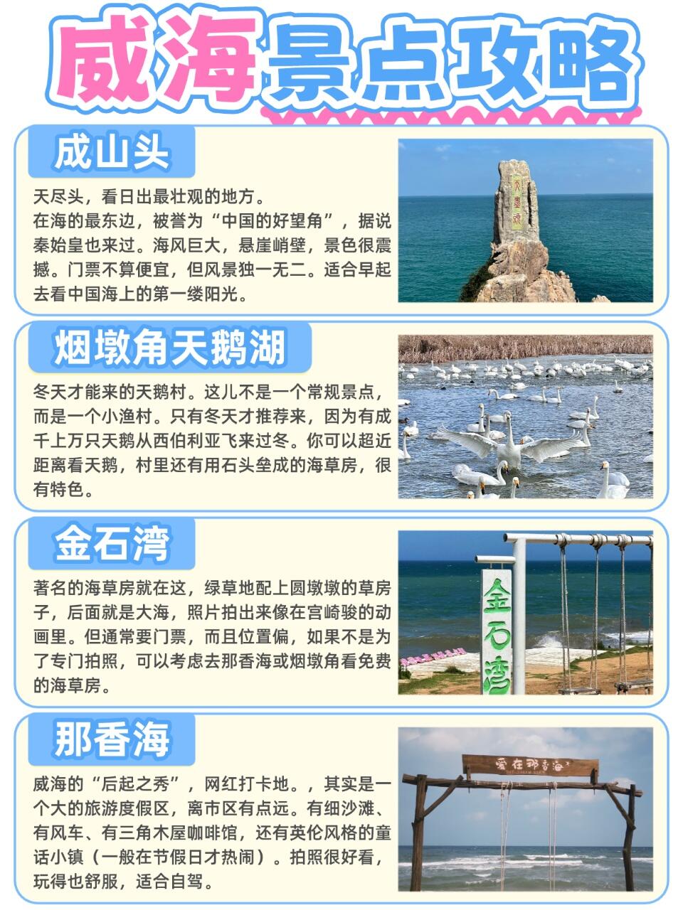 小tips:去刘公岛要坐船,穿舒服的鞋;成山头看日出绝美但风大;想看天鹅得冬天去烟墩角;金石湾海草房拍照好看但要门票,那香海和烟墩角有免费的。
