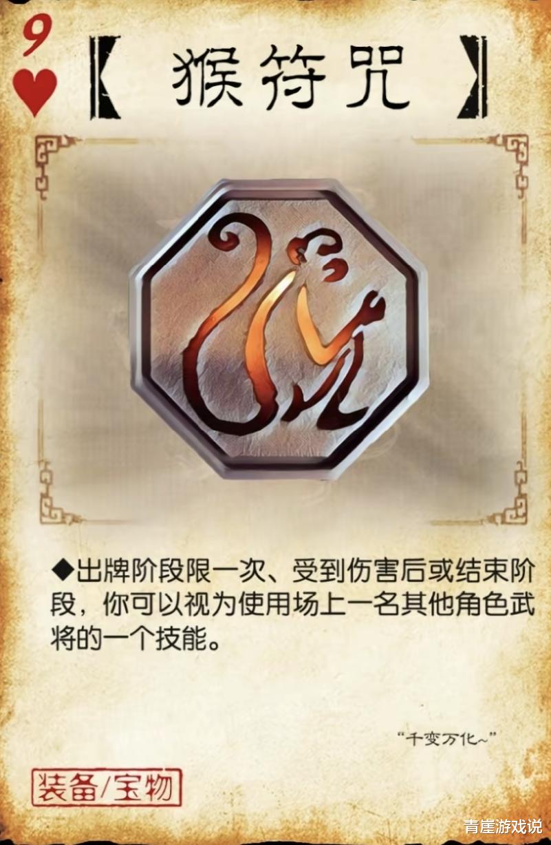 猴符咒的能力是变化,可以变化成任意想化身的事物。三国杀猴符咒在出牌阶段、受到伤害、回合结束时都能视为使用一次其他角色的技能。猴符咒这种效果完全类似许劭,虽然没有超高上限,但只是使用场上玩家的技能同样变态,偷走最强武将的技能,创造的收益不可估量!