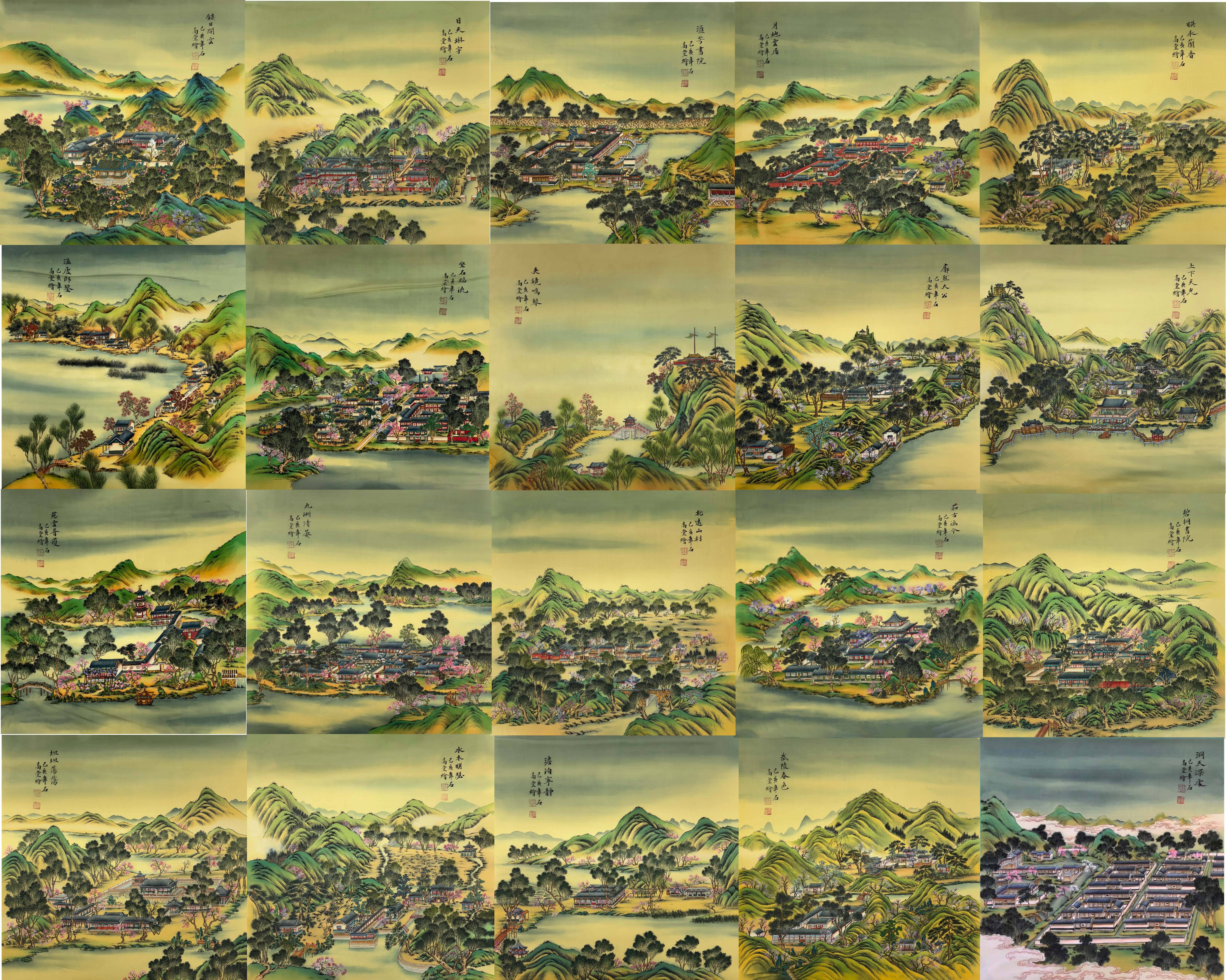 1. 正大光明 2. 勤政亲贤 3. 九洲清晏 4. 镂月开云 5. 天然图画 6. 碧桐书院 7. 慈云普护 8. 上下天光 9. 杏花春馆 10. 坦坦荡荡 11. 茹古涵今 12. 长春仙馆 13. 万方安和 14. 武陵春色 15. 山高水长 16. 月地云居 17. 鸿慈永祜 18. 汇芳书院 19. 日天琳宇 20. 澹泊宁静 21. 映水兰香 22. 水木明瑟 23. 濂溪乐处 24. 多稼如云 25. 鱼跃鸢飞 26. 北远山村 27. 西峰秀色 28. 四宜书屋 29. 方壶胜境 30. 澡身浴德 31. 平湖秋月 32. 蓬岛瑶台 33. 接秀山房 34. 别有洞天 35. 夹镜鸣琴 36. 涵虚朗鉴 37. 廓然大公 38. 坐石临流 39. 曲院风荷 40. 洞天深处
