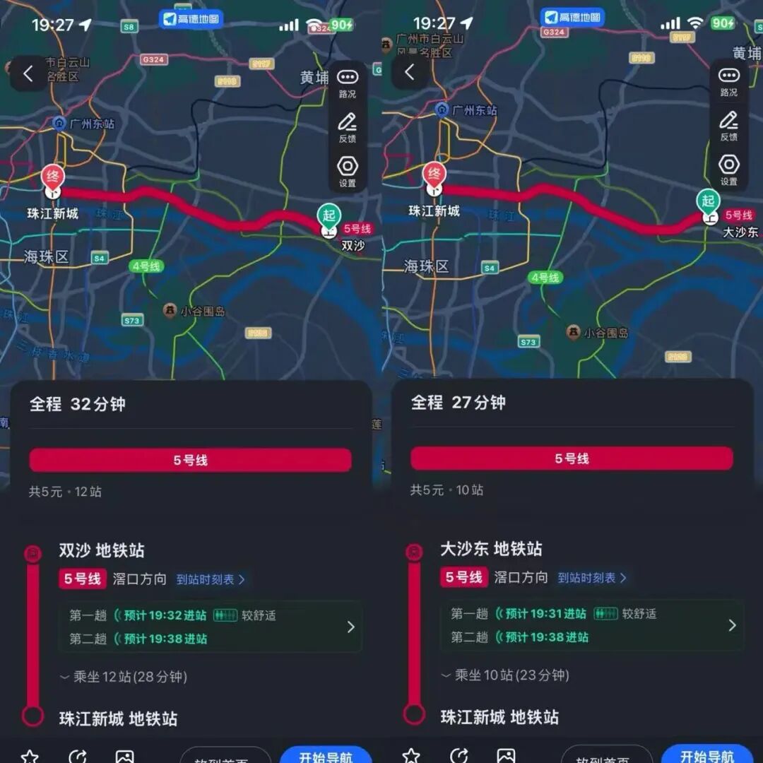 比如珑岄上城、黄埔润府、中央公馆,就有很强的地铁盘属性,两者都是地铁上盖。其中,珑岄上城、黄埔润府分别紧挨着双沙地铁站和大沙东地铁站。而中央公馆距离大沙东地铁站直线距离,只有300米。据高德地图导航显示,这两个地铁站到珠江新城全城用时仅30分钟左右,住大盘的业主还没走出小区,你可能已经快到了。