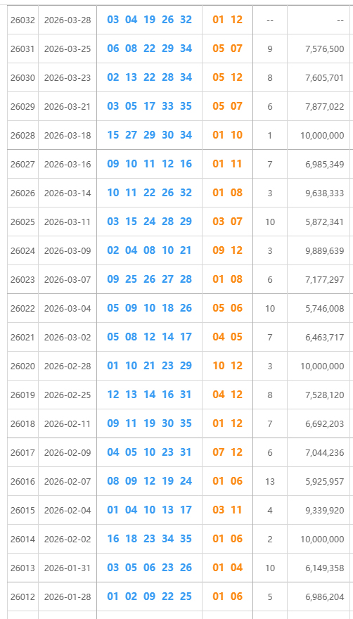 前区奇偶:奇数有03、19两个,偶数有04、26、32三个,奇偶比2:3。这个比例在正常波动范围内,偶数稍微占点优势,但谈不上一边倒。后区奇偶:01是奇,12是偶,奇偶比1:1,标准均衡。整体来看,这期号码在奇偶分布上比较“守规矩”,没有出现极端情况。