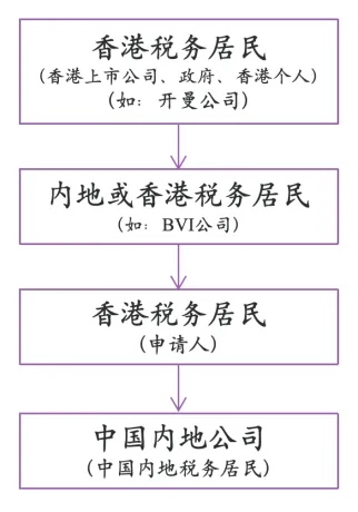 若申请人本身不符合“受益所有人”条件,但其100%直接或间接持股的股东符合条件且为同一税收管辖区的居民,仍可享受协定待遇(以缔约方为香港为例,如下图)。