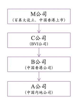 A公司是一家内地和香港合资企业,内地股东持股60%,香港股东B公司持股40%,主要经营范围为酒店管理。B公司是在中国香港注册成立的一家酒店管理公司,其100%持股方为C公司。C公司注册成立于英属维尔京群岛,是香港上市公司的全资子公司。M公司成立于百慕大,于1998年在香港上市,主要从事酒店管理。股权结构如下图所示。