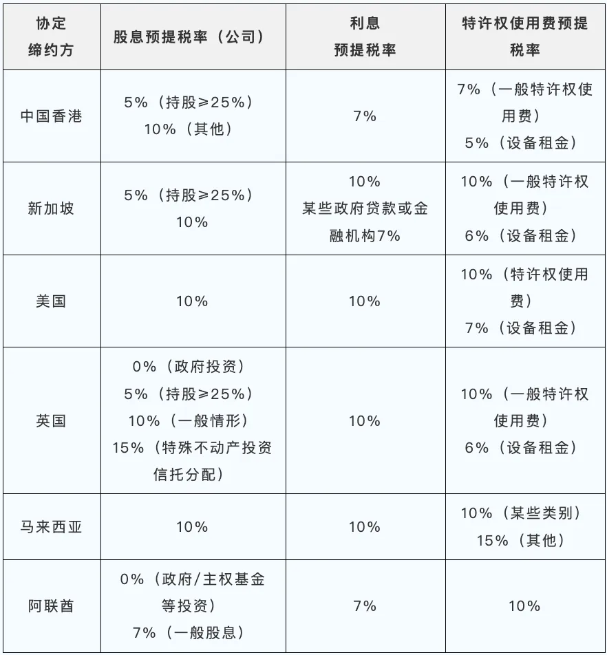 部分税收协定预提所得税税率