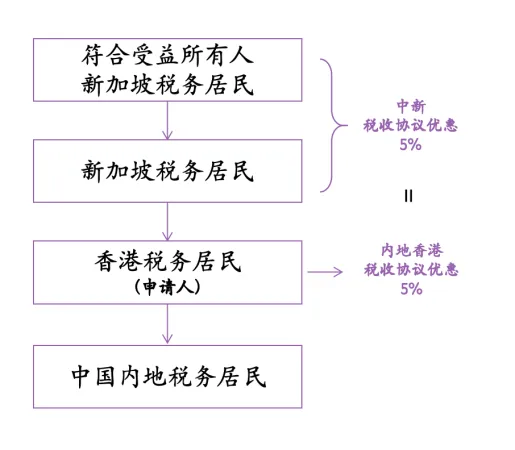 即使为符合受益所有人的非同一税收管辖区的居民,但其自身以及中间的控股层级均为“符合条件的人”(即其可享受的协定待遇与申请人本可享受的相同或更优惠;以缔约方为香港为例,如下图,新加坡与内地税收协议优惠同为5%,均属于“符合条件的人”),申请人也可享受协定待遇。