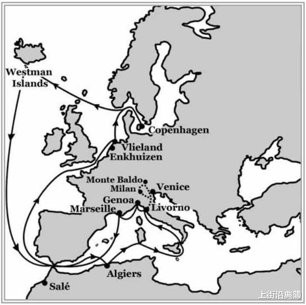 1627年夏天,冰岛渔民看到海平线上有一支船队出现。那不是探险队,也不是商船。等他们反应过来的时候,港口已经被封锁了。这支船队来自北非,离冰岛超过4000公里。他们抓走了400多名冰岛居民,把他们卖到奴隶市场。(下图,欧洲人在阿尔及尔被贩卖)